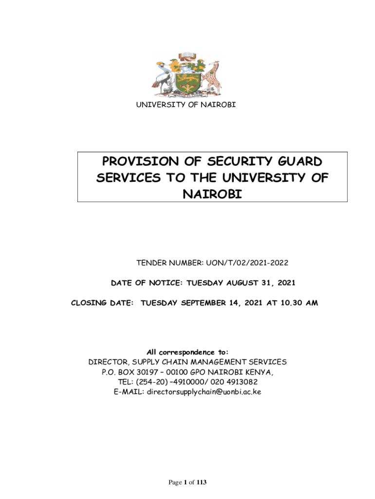 UNIVERSITY OF NAIROBIPROVISION OF SECURITY GUARD SERVICES TO THE UNIVERSITY OF NAIROBITENDER NUMBER: ON/T/02/20212022 DATE OF NOTICE: TUESDAY, AUGUST 31, 2021, CLOSING DATE: TUESDAY, SEPTEMBER 14,