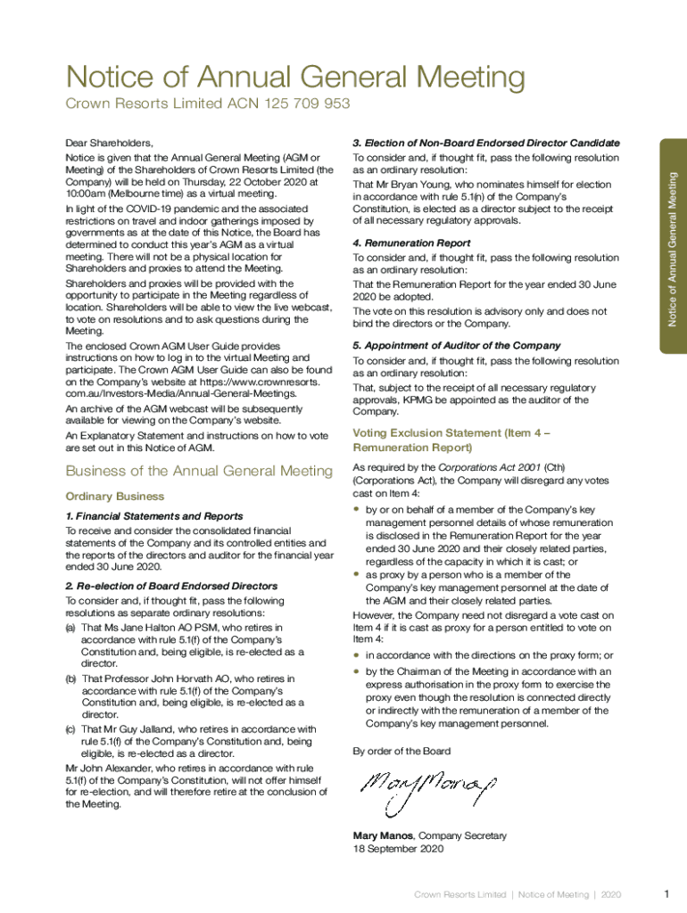 Notice of Annual General Meeting Dear Shareholders,3. Election of Onboard Endorsed Director CandidateNotice is given that the Annual General Meeting (AGM or Meeting) of the Shareholders of Crown Resorts