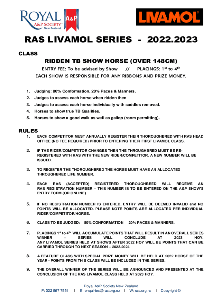 RAS RIVAL SERIES 2022.2023 CLASSRIDDEN TB SHOW HORSE (OVER 148CM) ENTRY FEE: To be advised by Show//PLACINGS: 1st to 4thEACH SHOW IS RESPONSIBLE FOR ANY RIBBONS AND PRIZE MONEY.1. Judging: 80% Conformation,