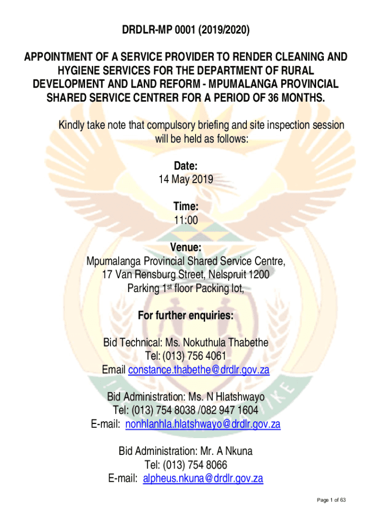 DRDLRMP 0001 (2019/2020) APPOINTMENT OF A SERVICE PROVIDER TO RENDER CLEANING AND HYGIENE SERVICES FOR THE DEPARTMENT OF RURAL DEVELOPMENT AND LAND REFORM MPUMALANGA PROVINCIAL SHARED SERVICE CENTER