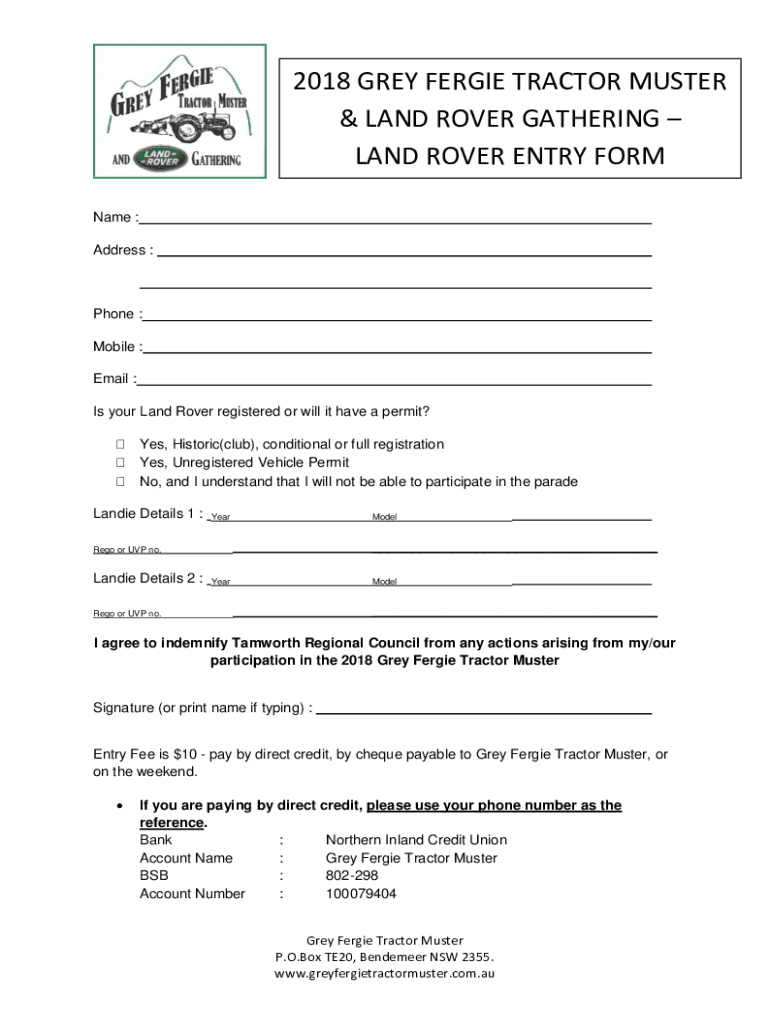 2018 GREY FER GIE TRACTOR MUSTER & LAND ROVER GATHERING LAND ROVER ENTRY FORM Name : Address :Phone : Mobile : Email : Is your Land Rover registered or will it have a permit? Yes, Historic(club),