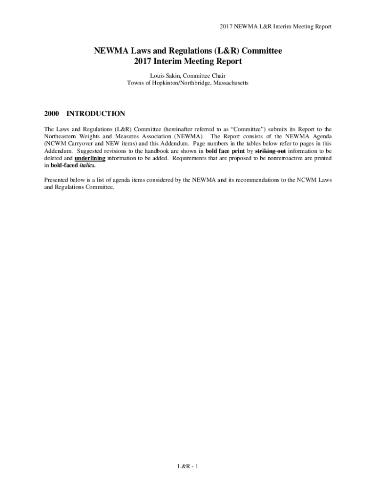 2017 NEWMAN L&R Interim Meeting ReportNEWMA Laws and Regulations (L&R) Committee 2017 Interim Meeting Report Louis Skin, Committee Chair Towns of Opinion/North bridge, Massachusetts2000INTRODUCTIONThe