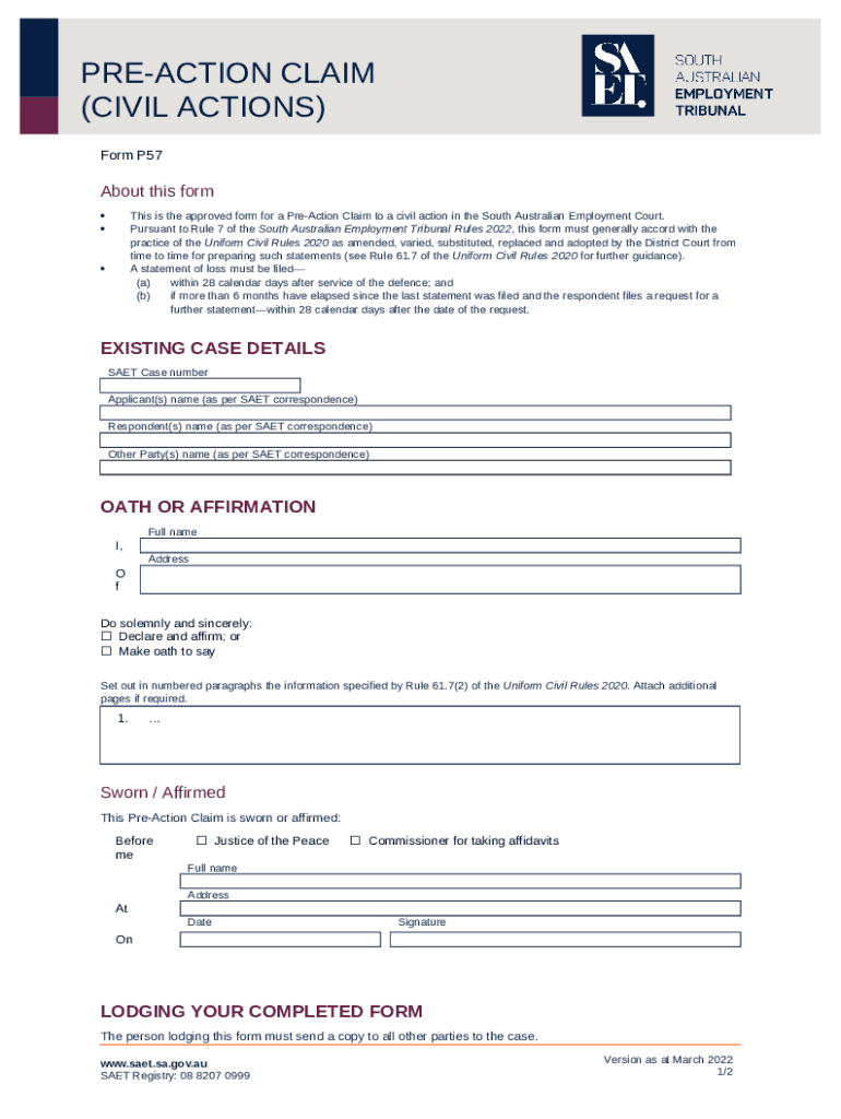What is Pre-Action Claim (Civil Actions). P57 Form?