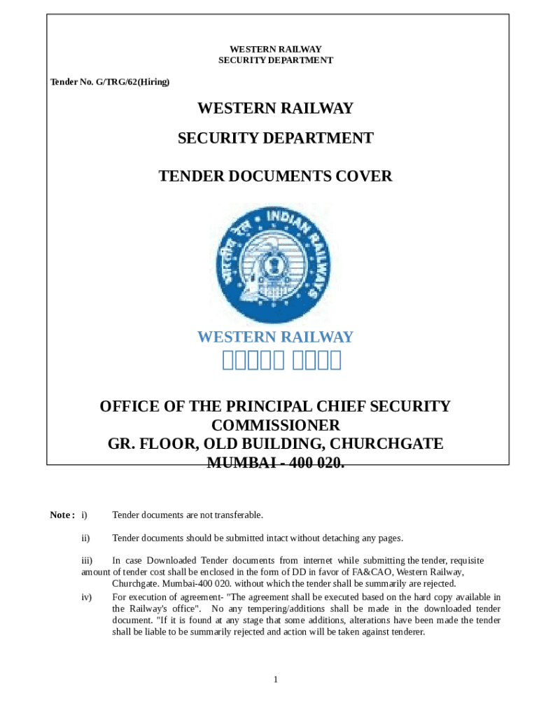 Instructions for the form western railway security department tender documents cover - wr indianrailways gov
