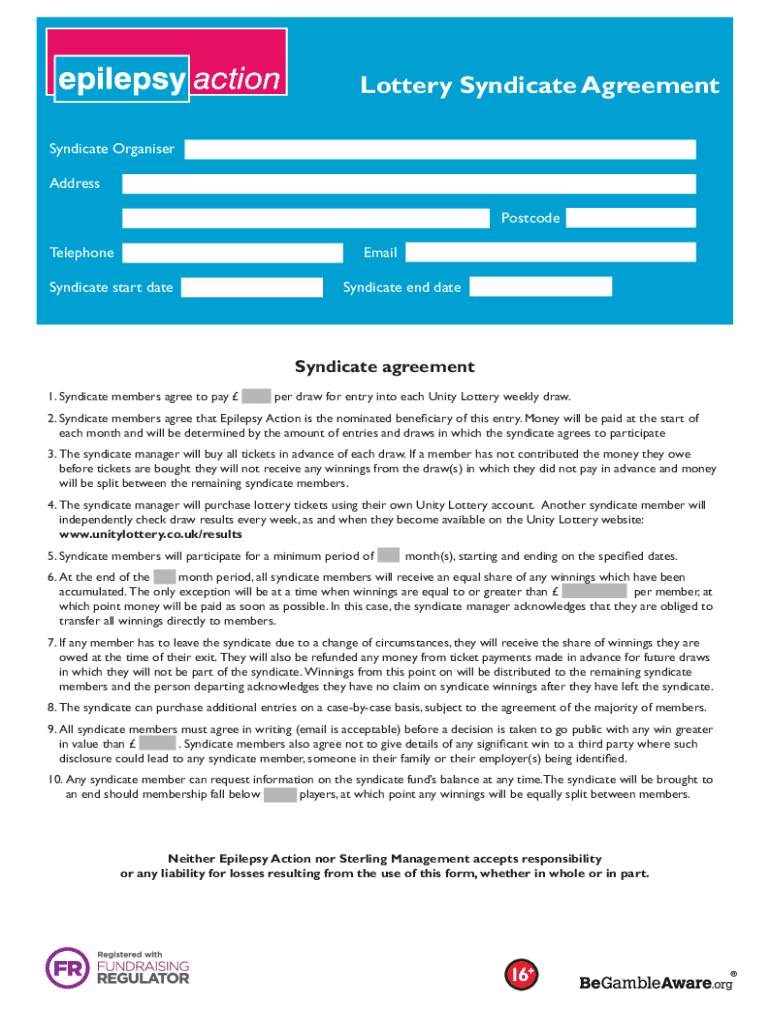 Lottery Syndicate Agreement Syndicate Organizer Address Postcode: TelephoneEmailSyndicate start dateSyndicate end dateSyndicate agreement 1. Syndicate members agree to pay per draw for entry into