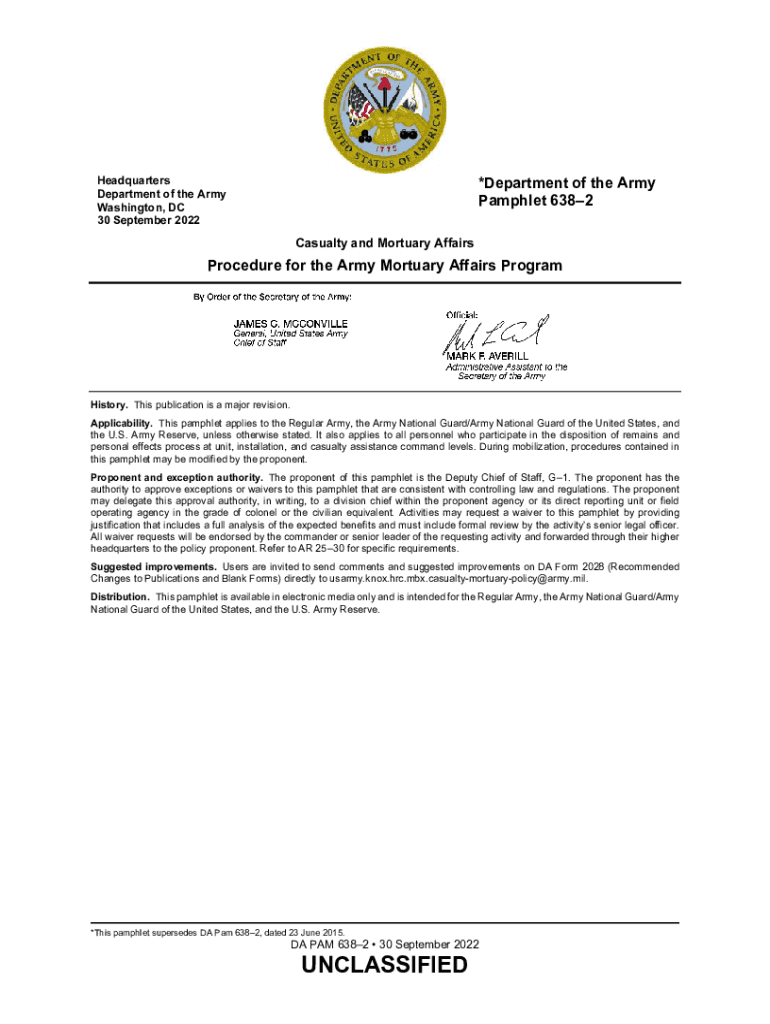*Department of the Army Pamphlet 6382Headquarters Department of the Army Washington, DC 30 September 2022Casualty and Mortuary AffairsProcedure for the Army Mortuary Affairs ProgramHistory. This publication