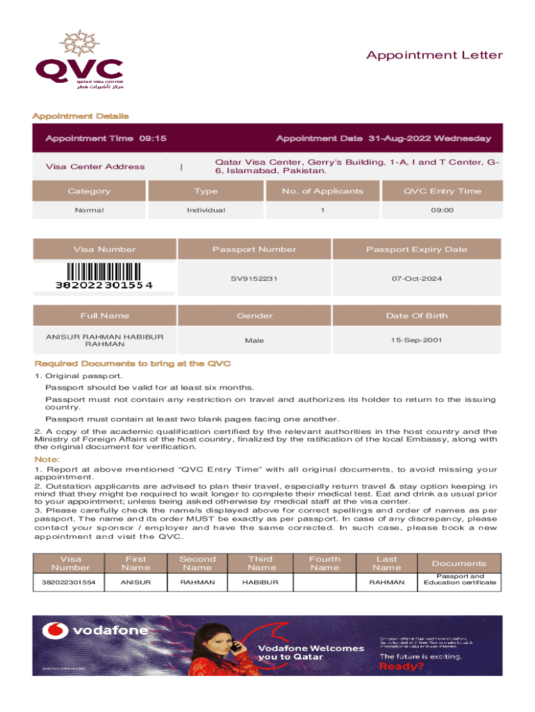 Appointment LetterAppointment Details Appointment Time 09:15Visa Center AddressAppointment Date 31Aug2022 Wednesday Qatar Visa Center, Gerry's Building, 1A, I and T Center, G6, Islamabad, Pakistan.|CategoryTypeNo.