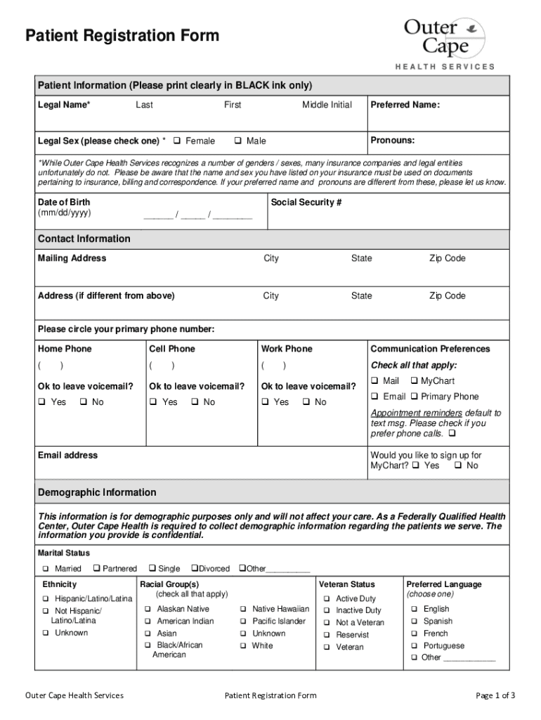 Patient Registration Form Patient Information (Please print clearly in BLACK ink only) Legal Name×LastFirstLegal Sex (please check one) * FemaleMiddle Initial MalePreferred Name:Pronouns:*While Outer