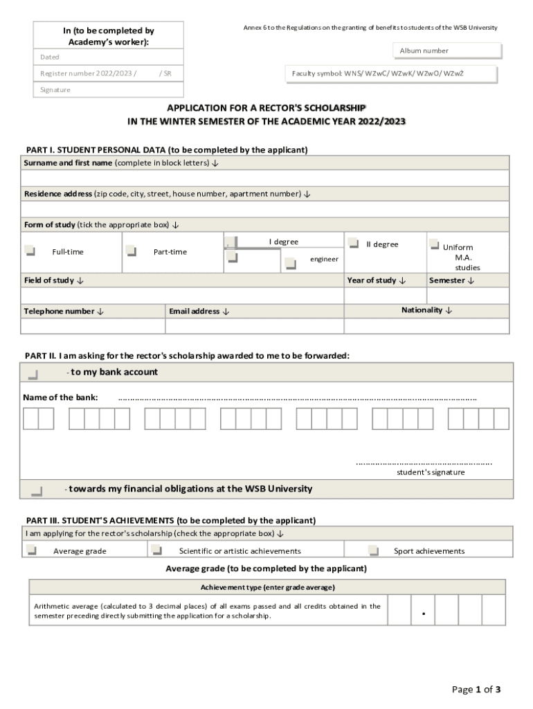 Annex 6 to the Regulations on the granting of benefits to students of the WSB University In (to be completed by Academies worker):Album numerated Register number 2022/2023 // Faculty symbol: WNS/