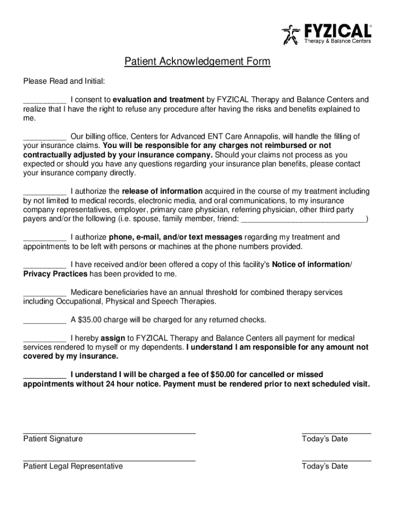 Patient Acknowledgement Form Please Read and Initial: ___ I consent to evaluation and treatment by TYPICAL Therapy and Balance Centers and realize that I have the right to refuse any procedure after