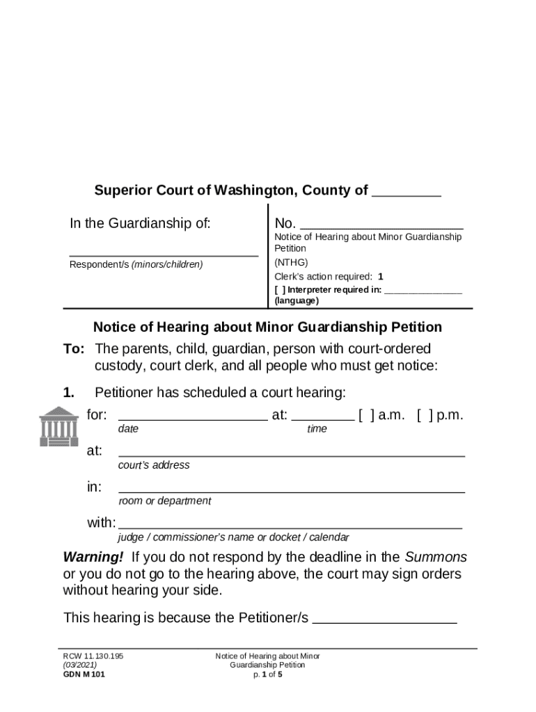 No. Notice of Hearing about Minor Guardianship Petition To template instructions