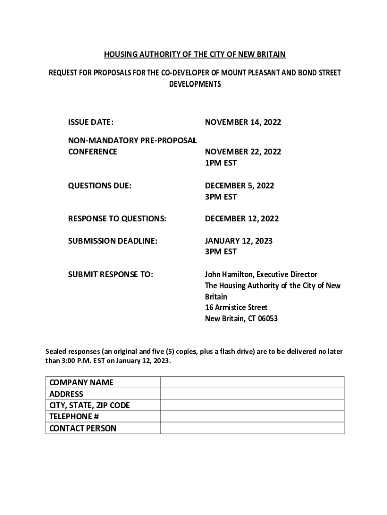 HOUSING AUTHORITY OF THE CITY OF NEW BRITAINREQUEST FOR PROPOSALS FOR THE CODEVELOPER OF MOUNT PLEASANT AND BOND STREET