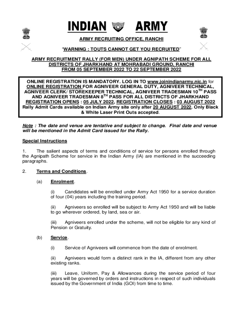 ARMY RECRUITMENT RALLY (FOR MEN) UNDER ANIMATE SCHEME FOR ALL