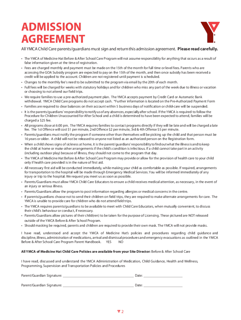 YMCA of Medicine Hat Before & After School Care Payment Package150 Ash Ave SE, Medicine Hat, ABP 4035274426 medicinehatymca. Admission AGREEMENT All YMCA Child Care parents/guardians must sign and