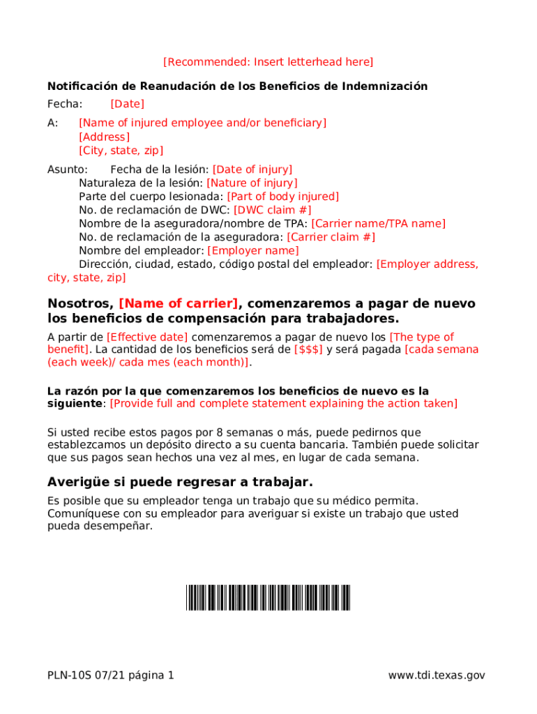Template Notificacin de Reanudacin de los Beneficios de Indemnizacin. Notificacin de Reanudacin de los Beneficios de Indemnizacin instructions