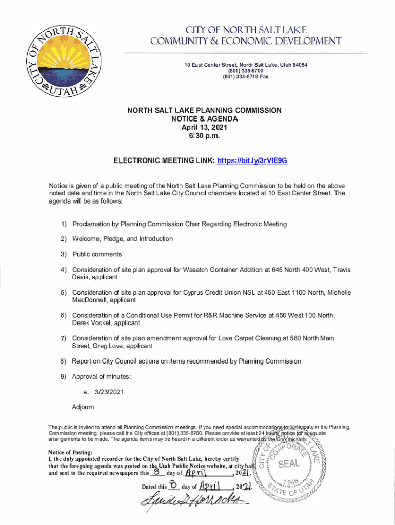 CITY OF NOR.TH SALT LAKE COMMUNITY & ECONOMIC DEVELOPMENT 1 0 East Center Street, North Salt Lake, Utah 84054 (801) 3358700 (801) 3358719 Cannot H SALT LAKE PLANNING COMMISSION NOTICE & AGENDA April