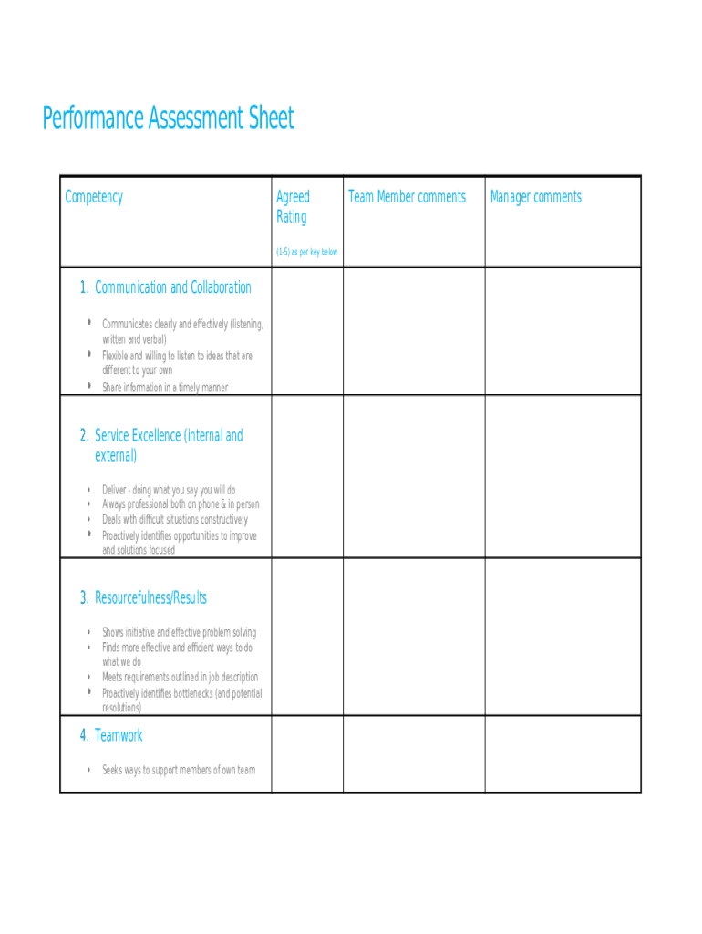 What is Perance Assessment Sheet Example Form?