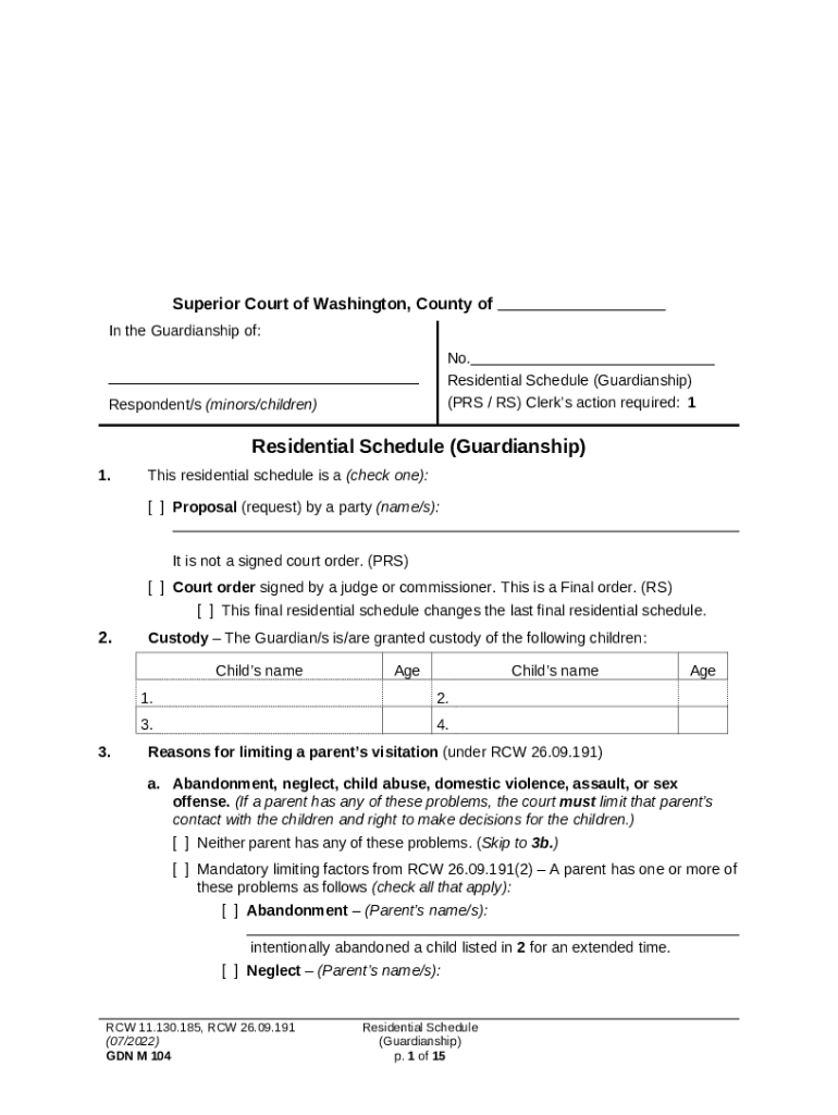 Template GDN M104 "Residential Schedule (Guardianship)" instructions
