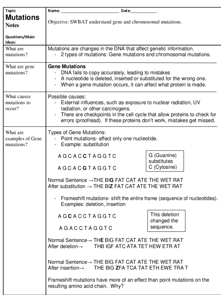 Topic:Mutations Forename: ___ Date:___Objective: SWEAT understand gene and chromosomal mutations. Questions/Main Ideas:What are mutations? Mutations are changes in the DNA that affect genetic information.