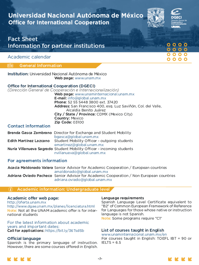 University National Autonomy de Mxico Office for International Cooperation Fact Sheet Information for partner institutions Academic calendar General Information Institution: University National Autonomy