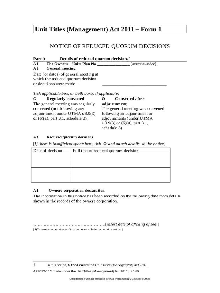 How to fill notice of reduced quorum decisions - ACT Legislation Register word template