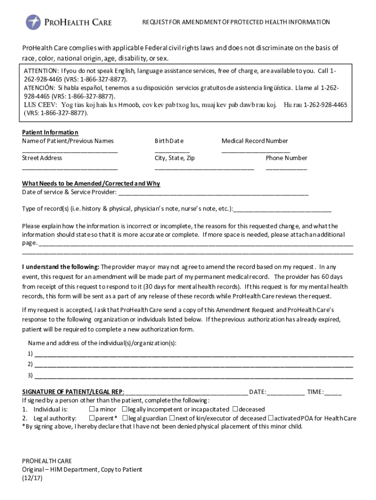 REQUEST FOR AMENDMENT OF PROTECTED HEALTH INFORMATIONProHealth Care complies with applicable Federal civil rights laws and does not discriminate on the basis of race, color, national origin, age,