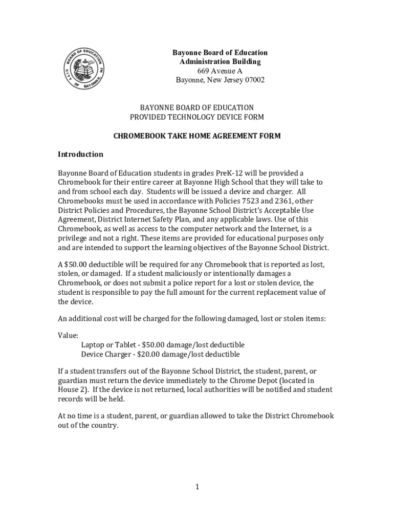 Bayonne Board of Education Administration Building 669 Avenue A Bayonne, New Jersey 07002BAYONNE BOARD OF EDUCATIONPROVIDED TECHNOLOGY DEVICE FORMCHROMEBOOK TAKE HOME AGREEMENT FORMIntroductionBayonne