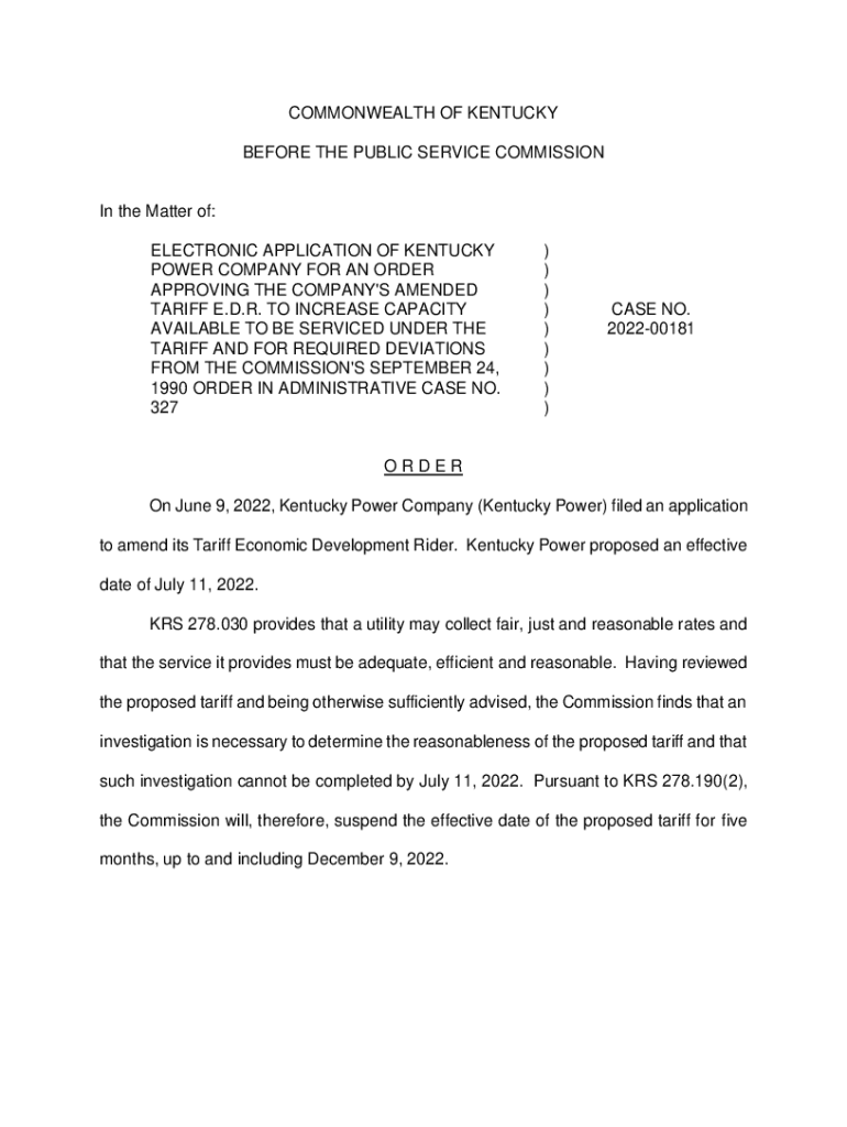 COMMONWEALTH OF KENTUCKY BEFORE THE PUBLIC SERVICE Commissioning the Matter of: ELECTRONIC APPLICATION OF KENTUCKY POWER COMPANY FOR AN ORDER APPROVING THE COMPANY\'S AMENDED TARIFF E.D.R. TO INCREASE