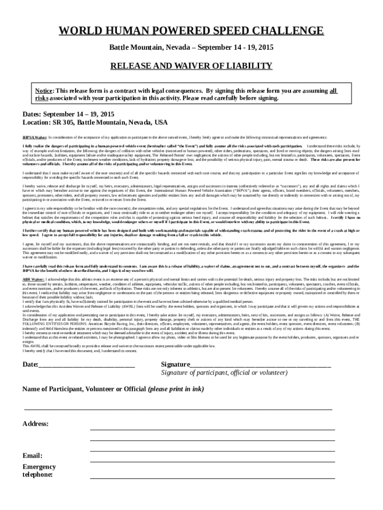 The International Human Powered Vehicle Association - WHPSC is a Word document that can be filled-out and signed for certain needs. Then, it is provided to the actual addressee in order to provide certain info and data. The completion and signing may be done manually or with an appropriate service e. g. PDFfiller. These applications help to submit any PDF or Word file online. It also lets you edit its appearance according to your needs and put a legal e-signature. Once finished, the user sends the International Human Powered Vehicle Association - WHPSC to the respective recipient or several recipients by mail and also fax. PDFfiller provides a feature and options that make your blank printable. It offers different settings for printing out. It doesn't matter how you deliver a document - in hard copy or electronically - it will always look neat and firm. To not to create a new writable document from scratch again and again, turn the original file into a template. Later, you will have a customizable sample.