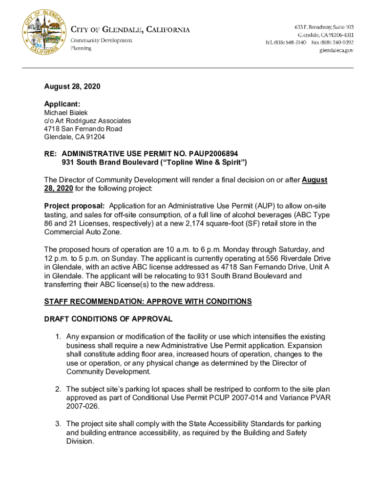 August 28, 2020, Applicant:Michael Bible c/o Art Rodriguez Associates 4718 San Fernando Road Glendale, CA 91204RE: ADMINISTRATIVE USE PERMIT NO. PAUP2006894 931 South Brand Boulevard (Towline Wine