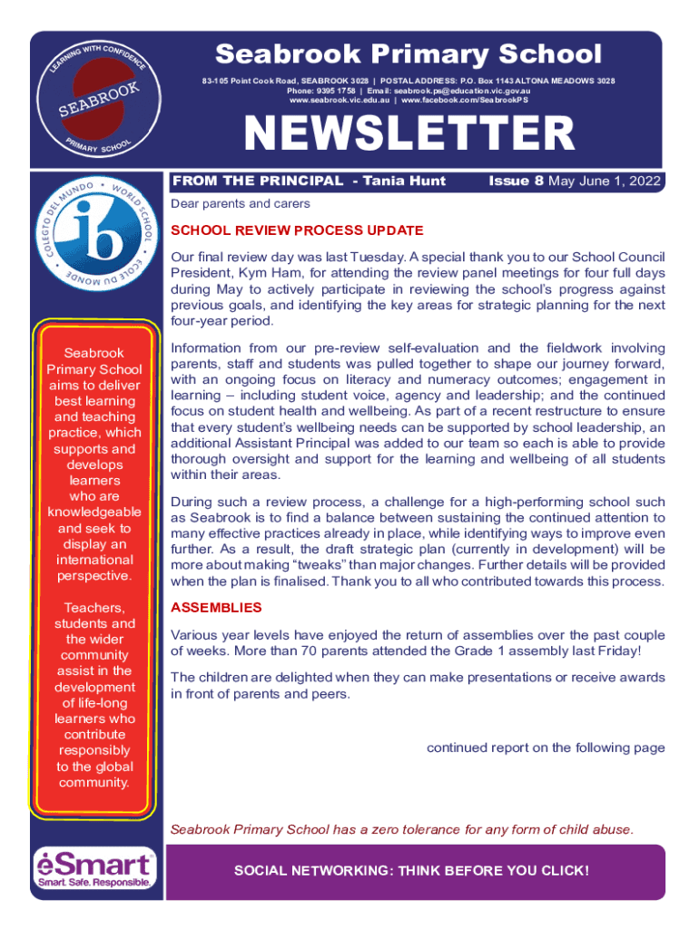 Newsletter - seabrook primary is a communication tool used by Seabrook Primary School to inform parents, students, and staff about important updates, events, and news related to the school.