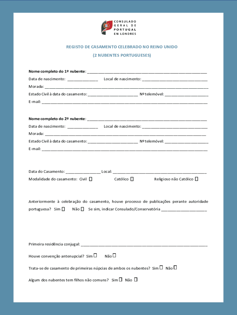 REGISTER DE CASEMENT CELEBRATE NO RENO UNIDO (2 FUENTES PORTUGUESE)Nome complete do 1 unbent: ___ Data de Nascimento: ___Local de Nascimento: ___Moreira: ___ Est ado Civil data do casement: ___ N