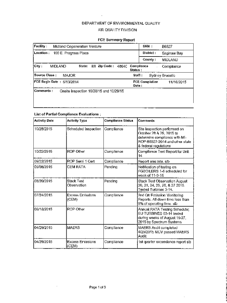 DEPARTMENT OF ENVIRONMENTAL QUALITY AIR QUALITY DIVISION FCE Summary Report Facility:Midland Cogeneration Ventures RN:B6527Location:100 E. Progress PlaceDistrict:Saginaw Account:MIDLANDCity:State:MIDLANDSource