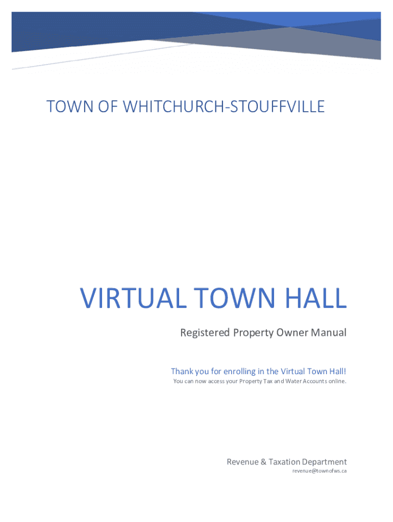 TOWN OF WHITCHURCHSTOUFFVILLEVIRTUAL TOWN HALL Registered Property Owner Manual Thank you for enrolling in the Virtual Town Hall! You can now access your Property Tax and Water Accounts online. Revenue