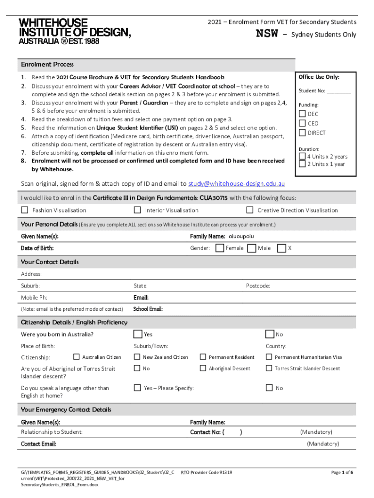 2021 Enrollment Form VET for Secondary Students NSW Sydney Students OnlyEnrolment Process Office Use Only:1. Read the 2021 Course Brochure & VET for Secondary Students Handbook. 2. Discuss your enrollment