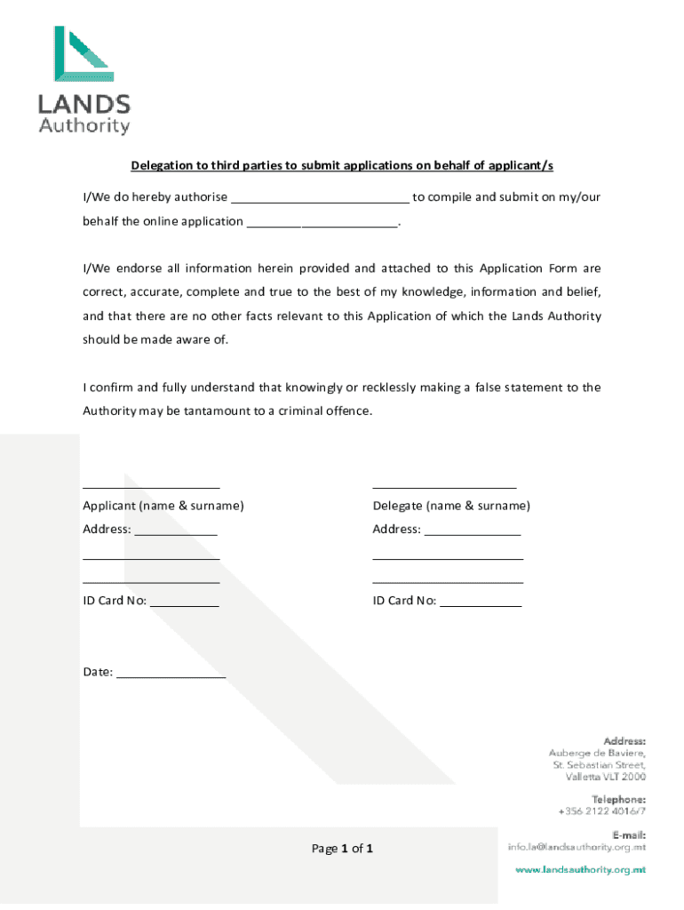 Delegation to third parties to submit applications on behalf of applicant/s I/We do hereby authorize ___ to compile and submit on my/our behalf the online application ___. I/We endorse all information