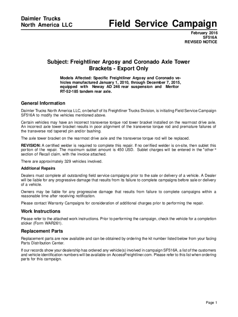 Daimler Trucks North America Oldfield Service Campaign February 2016 SF516A REVISED NOTICESubject: Freightliner Argosy and Coronado Axle Tower Brackets Export Only Models Affected: Specific Freightliner