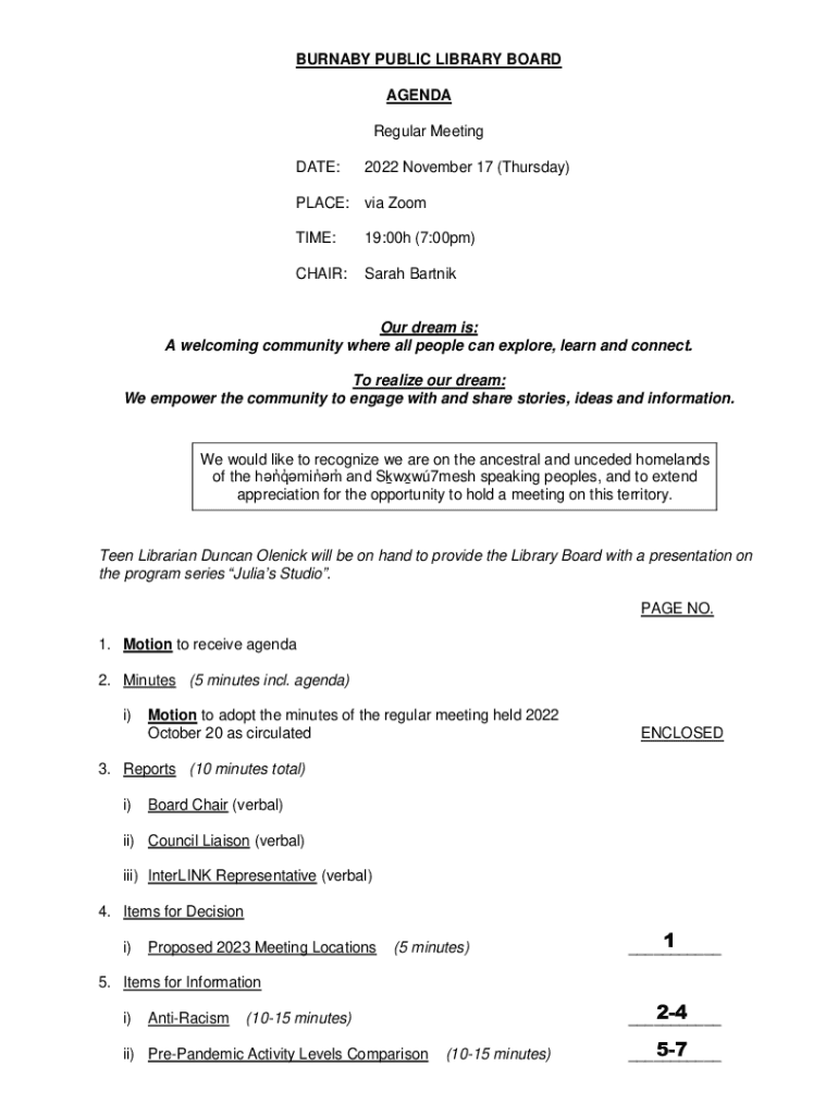 BURNABY PUBLIC LIBRARY BOARD AGENDA Regular Meeting DATE:2022 November 17 (Thursday)PLACE:via Zoom TIME:19:00h (7:00pm)CHAIR:Sarah BartnikOur dream is: A welcoming community where all people can explore,