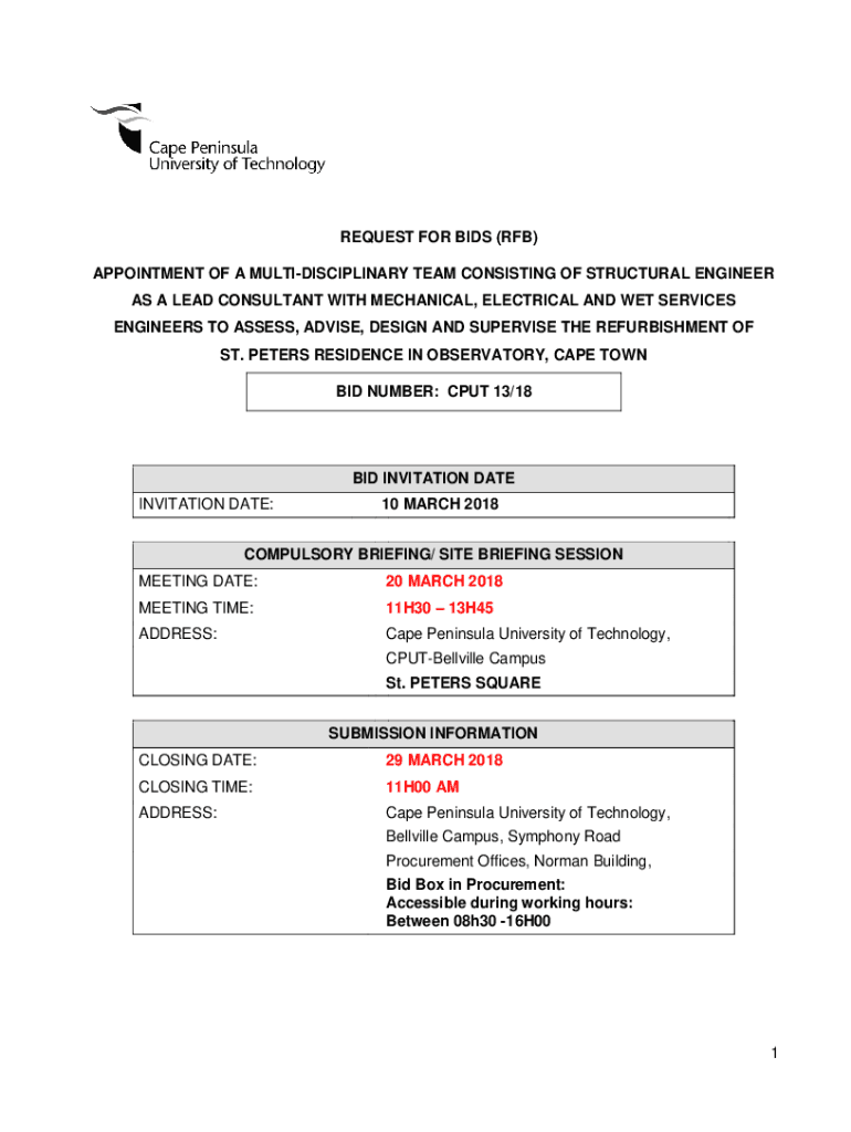 REQUEST FOR BIDS (ROB) APPOINTMENT OF A MULTIDISCIPLINARY TEAM CONSISTING OF STRUCTURAL ENGINEER AS A LEAD CONSULTANT WITH MECHANICAL, ELECTRICAL AND WET SERVICES ENGINEERS TO ASSESS, ADVISE, DESIGN