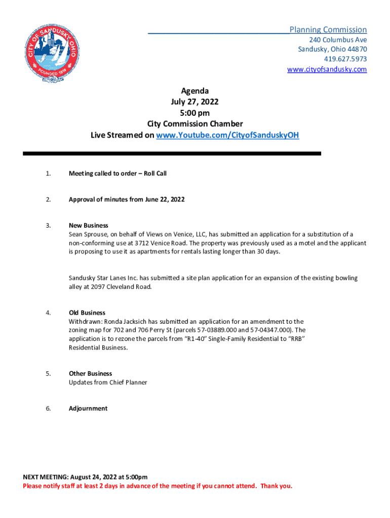 ___Planning Commission 240 Columbus Ave Sandusky, Ohio 44870 419.627.5973 www.cityofsandusky.comAgenda July 27, 2023 5:00 pm City Commission Chamber Live Streamed on www.Youtube.com/CityofSanduskyOH1.