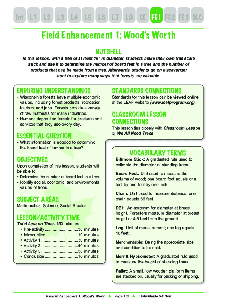 Int L1L2L3L4L5L6L7L8CE FE1 FE2 FE3 Garfield Enhancement 1: Wood\'s Worth NUTSHELL In this lesson, with a tree of at least 10 in diameter, students make their own tree scale stick and use it to determine