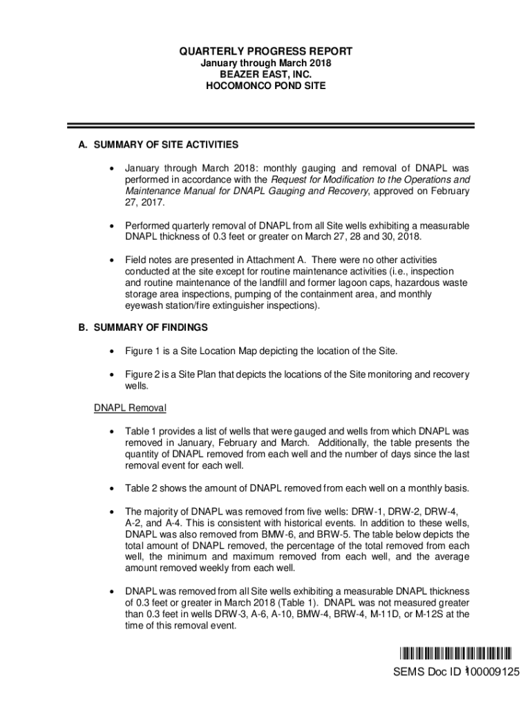 QUARTERLY PROGRESS REPORT January through March 2018 BEARER EAST, INC. HOCOMONCO POND SITE. SUMMARY OF SITE ACTIVITIES January through March 2018: monthly gauging and removal of DNAP was performed