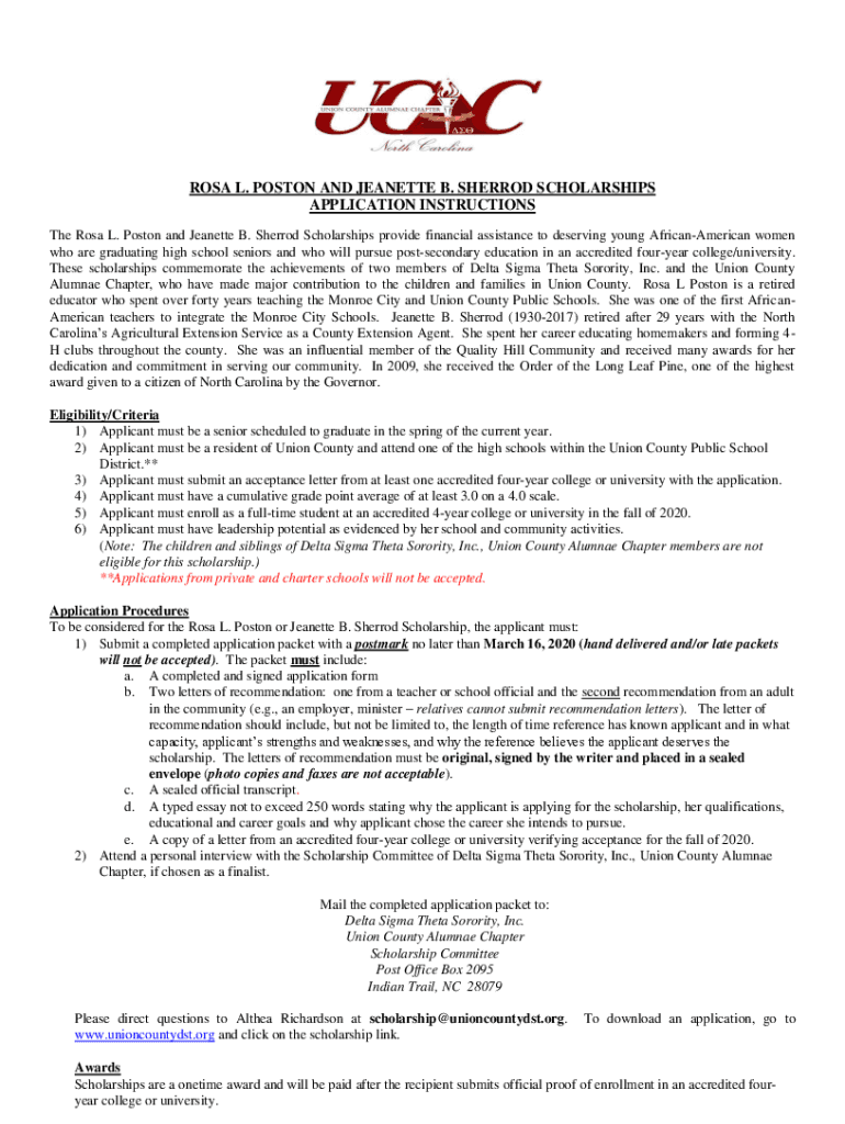 ROSA L. BOSTON AND JEANETTE B. SHERWOOD SCHOLARSHIPS APPLICATION INSTRUCTIONS The Rosa L. Boston and Jeanette B. Sherwood Scholarships provide financial assistance to deserving young African American