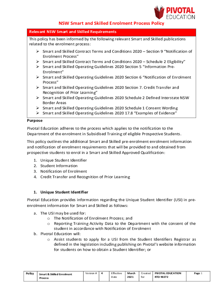 NSW Smart and Skilled Enrollment Process Policy Relevant NSW Smart and Skilled Requirements This policy has been informed by the following relevant Smart and Skilled publications related to the enrollment