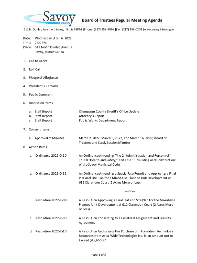 Board of Trustees Regular Meeting Agenda 611 N. Dunlap Avenue | Savoy, Illinois 61874 |Phone: (217) 3595894 |Fax: (217) 3590202 |www.savoy.illinois.govDate: Wednesday, April 6, 2023 Time: 7:00 PM