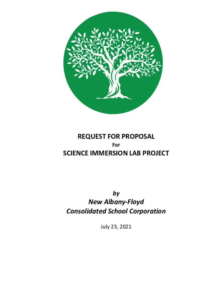 REQUEST FOR PROPOSAL Conscience IMMERSION LAB PROJECTbyNew Albany Floyd Consolidated School Corporation July 23, 2021New Albany Floyd Consolidated School Corp. TABLE OF CONTENTS Page Table of Contents2I.