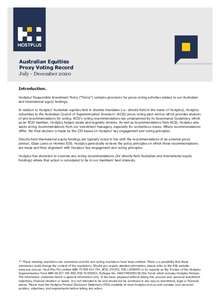 Australian Equities Proxy Voting Record July December 2020 Introduction. Host plus Responsible Investment Policy (Policy) contains provisions for proxy voting activities related to our Australian