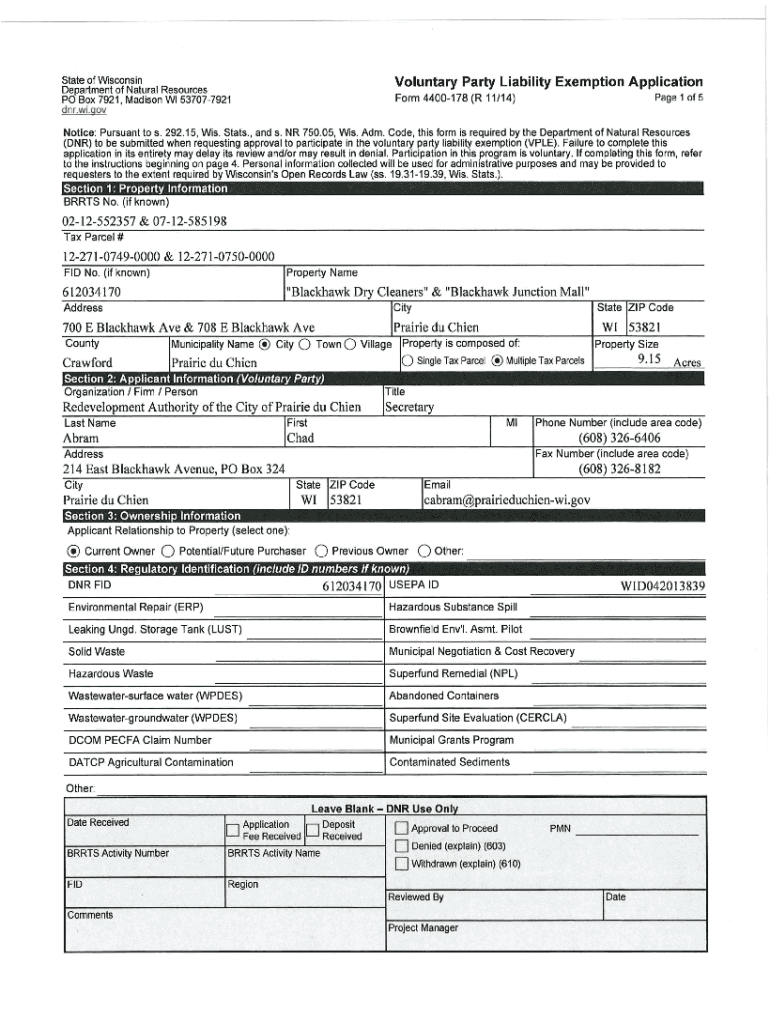 State of Wisconsin Department of Natural Resources PO Box 7921, Madison WI 537077921 DNR.WI.voluntary Party Liability Exemption Application Form 4400178 (R 11/14)Page 1 of 5Notice: Pursuant to s.