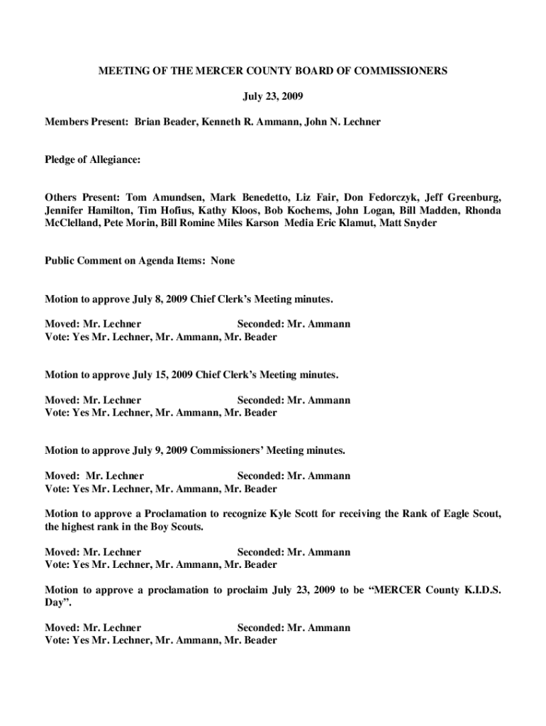 MEETING OF THE MERCER COUNTY BOARD OF COMMISSIONERS July 23, 2009, Members Present: Brian Leader, Kenneth R. Amman, John N. LechnerPledge of Allegiance:Others Present: Tom Amundsen, Mark Benedetto,