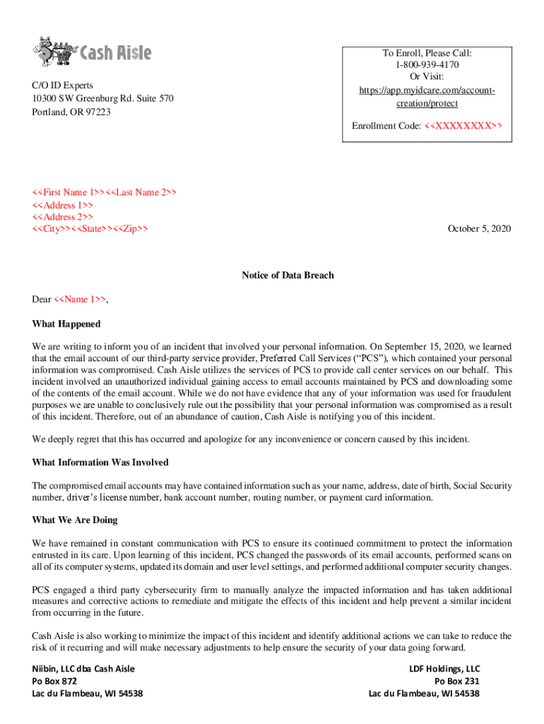 To Enroll, Please Call: 18009394170 Or Visit: https://app.myidcare.com/accountcreation/protectC/O ID Experts 10300 SW Green burg Rd. Suite 570 Portland, OR 97223Enrollment Code: XXXXXXXXFirst Name